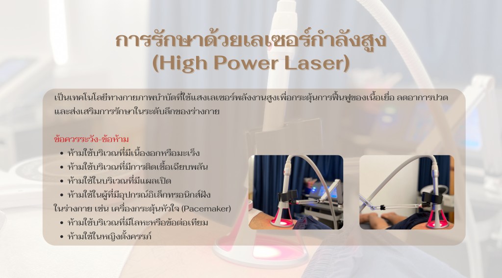การรักษาด้วยเลเซอร์กำลังสูง เป็นการใช้แสงเลเซอร์พลังงานสูง ยิงเข้าไปยังเนื้อเยื่อในระดับลึก เพื่อกระตุ้นการฟื้นฟูของเนื้อเยื่อ ลดอาการปวด ลดอักเสบ เร่งการซ่อมแซมเนื้อเยื่อ