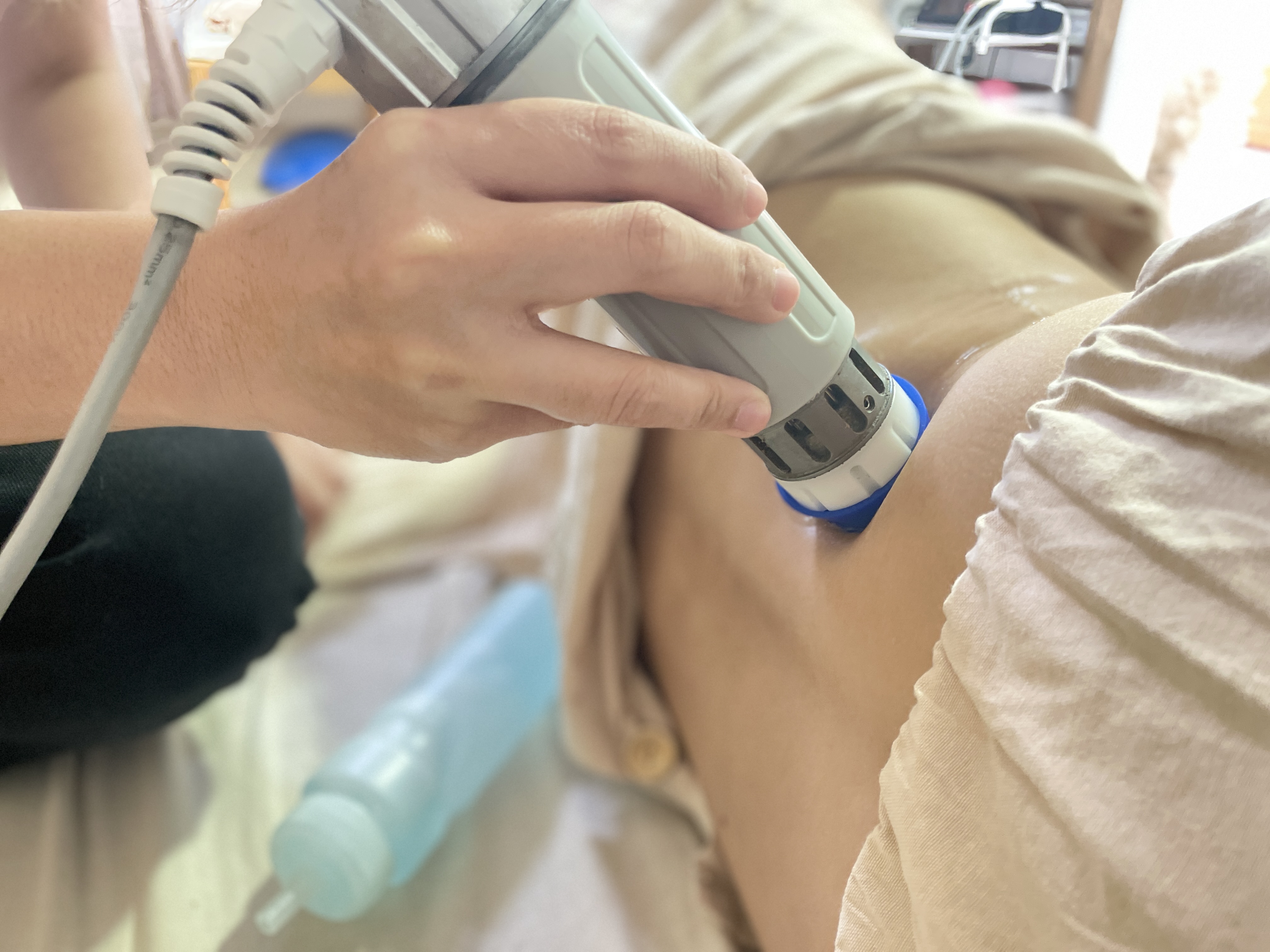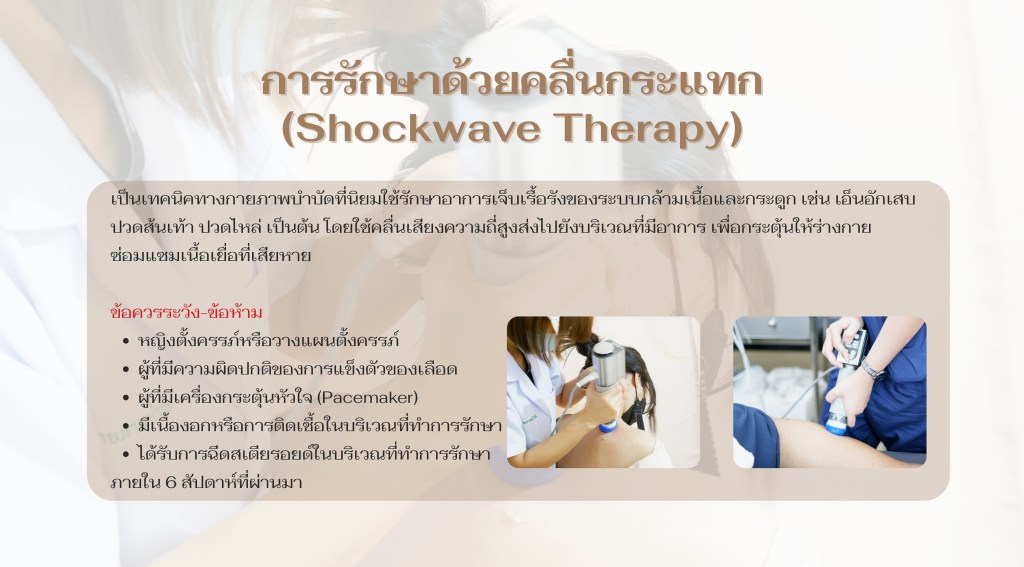 การรักษาด้วยคลื่นกระแทก หรือเครื่อง Shockwave จะนิยมใช้รักษาอาการเจ็บเรื้อรังของกล้ามเนื้อและกระดูก เช่น เอ็นอักเสบ ปวดส้นเท้า ปวดกล้ามเนื้อต่าง ๆ โดยจะใช้บริเวณที่มีอาการปวด เพื่อกระตุ้นให้ร่างกายซ่อมแซมเนื้อเยื่อที่เสียหาย และคลายกล้ามเนื้อที่มีการตึงตัว